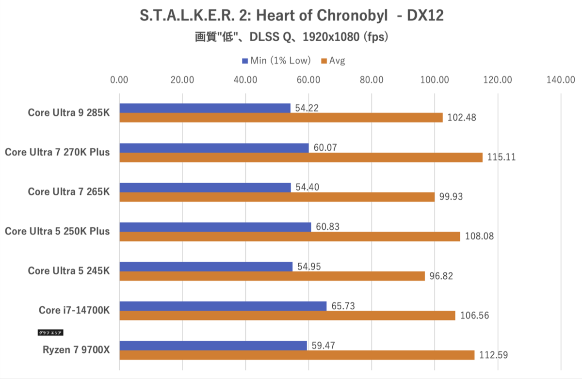 このゲームではRyzen 7 9700XやCore i7-14700Kが奮闘しているパターン。Core Ultra 200S Plusシリーズは決して悪くないが、競合や前々世代にここまで並ばれてしまうと旗色はあまり良くない。