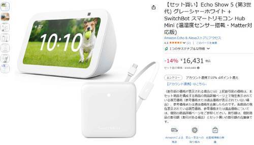「Echo Show 5(第3世代)+SwitchBot Hub Mini」がセット割引対象。セット品の価格19,160円のところ、14%オフの16,431円で販売中。