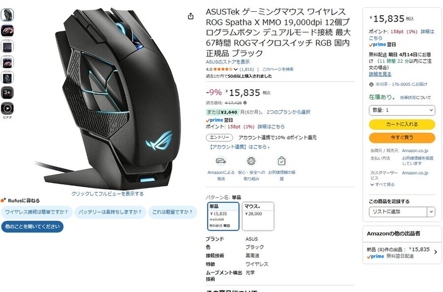 Amazon.co.jpにて、ASUSのワイヤレスゲーミングマウス「ROG Spatha X」が販売中だ。過去価格は1万7428円だが、執筆時点では9%オフの1万5835円で購入できる(4月13日時点)。