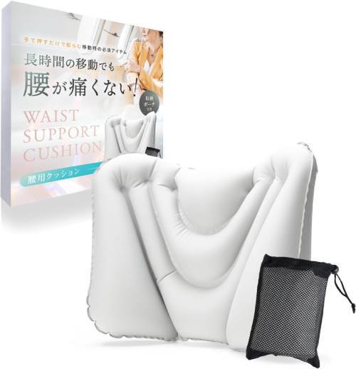 空気を入れるクッションは便利でも、口で膨らませるタイプだと外では少し使いづらい。この腰用クッションは口をつけずに膨らませられる仕様で、取り出してそのまま使える。外出先でも気にせず使えるのは地味に助かるポイント。
