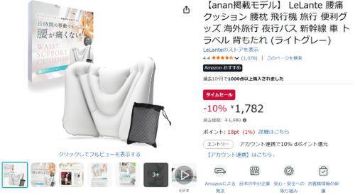 LeLante 腰用クッションがAmazonタイムセール対象。過去価格1,980円のところ、10%オフの1,782円で販売中。