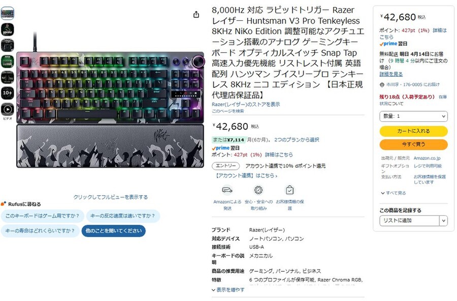 Amazon.co.jpにて、Razerのゲーミングキーボード「Huntsman V3 Pro Tenkeyless 8KHz NiKo Edition」が販売中だ。価格は4万2680円。