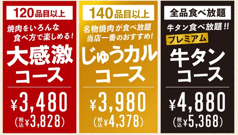 今回のキャンペーンでは、大感激コース、じゅうカルコース、牛タンプレミアムコースを対象に、平日ディナータイムの食べ放題を「時間無制限」で楽しめます。対象時間は各日16時以降です。