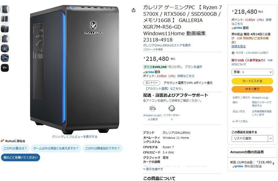 Amazon.co.jpにて、GALLERIAのゲーミングPC「GALLERIA XGR7M-R56-GD」が販売中だ。価格は21万8480円。