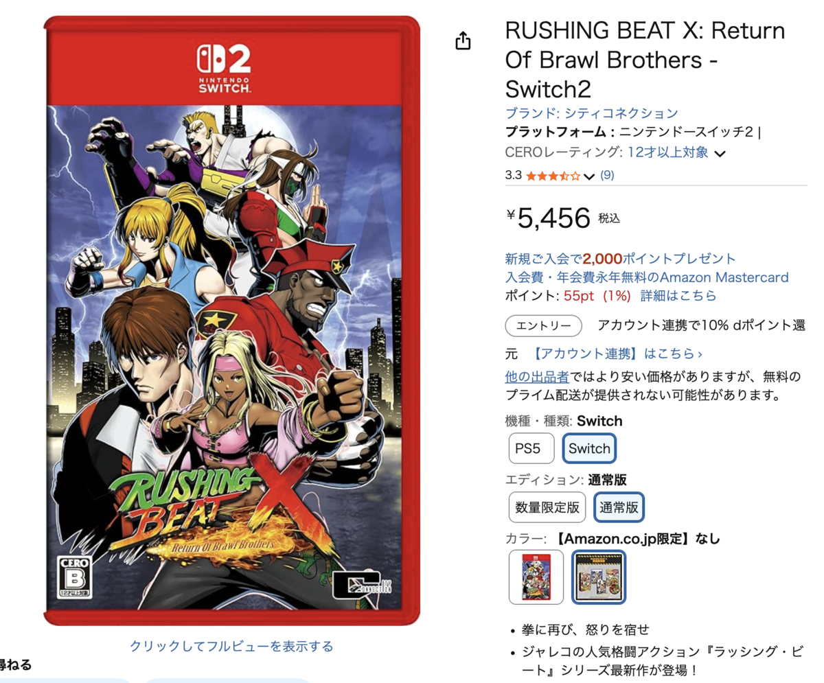 というわけで、今回は「RUSHING BEAT X: Return Of Brawl Brothers」を取り上げます。AmazonではSwitch 2版が5,456円で購入できます(4月13日現在)。