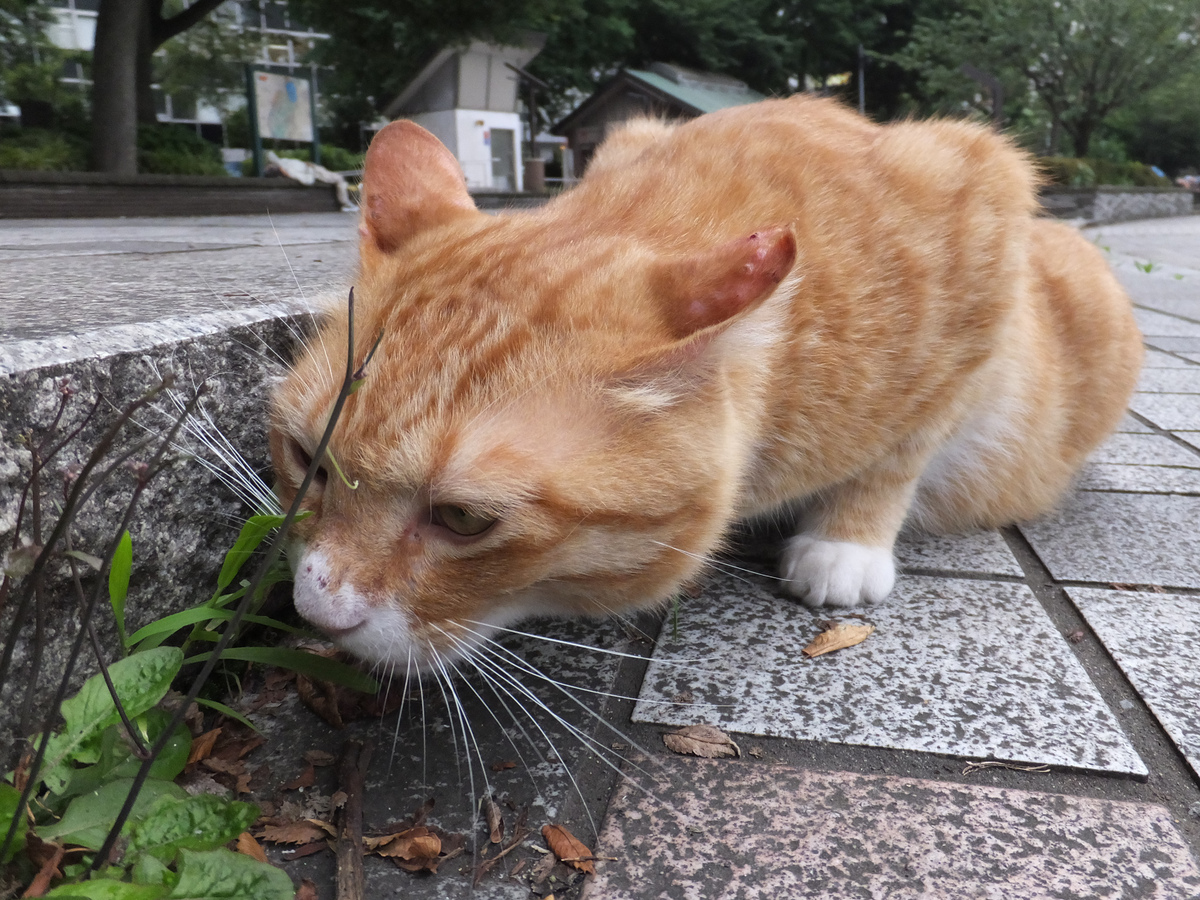 これなら、夜の猫も撮れるかも! と撮ったのがこちら。駅前の通りで、居酒屋の前に猫が何匹かいるなと思ったら、お店の人がときどき余り物をあげていたようで、それを狙ってぐいっと背を伸ばした猫が可愛い。
