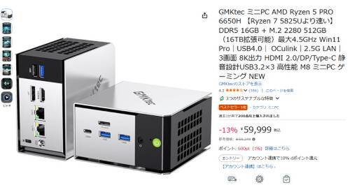 GMKtecのミニPC「GMKtec M8(Ryzen 5 PRO 6650H搭載)」がAmazonで割引中。参考価格69,249円のところ、13%オフの59,999円で販売中。