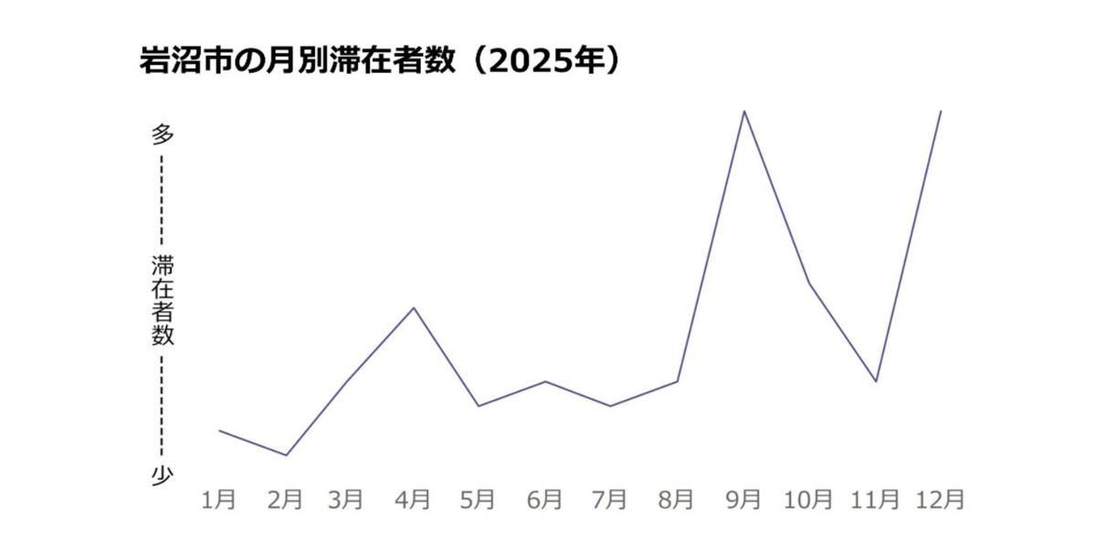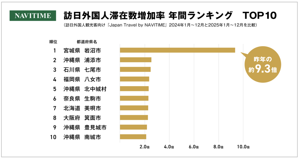 今回の分析では、2024年と2025年の年間データを比較し、市区町村別の滞在増加率を算出しました。その結果、1位は宮城県岩沼市で前年比9.33倍、2位は沖縄県浦添市(2.55倍)、3位は石川県七尾市(2.47倍)となりました。