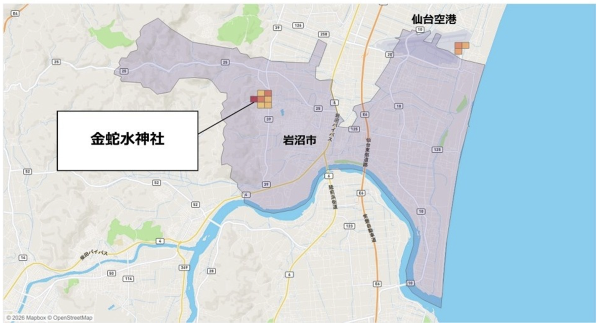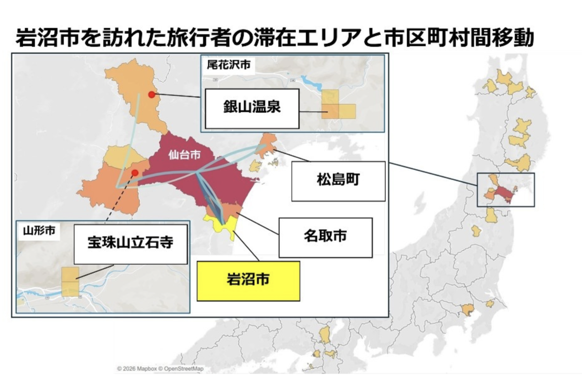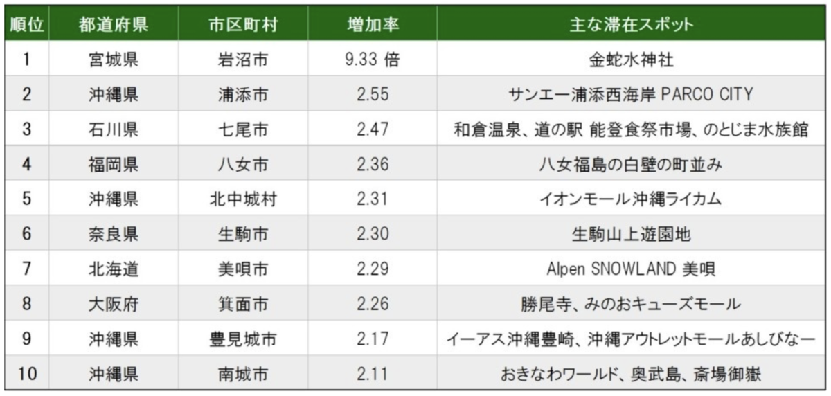 1位の岩沼市では、金蛇水神社での滞在が多く確認されており、特に中国や香港、台湾からの観光客に人気があるとされています。また、仙台空港の利用者が多く、周辺の仙台市や松島町、山形市などを含めた広域周遊が確認されています。