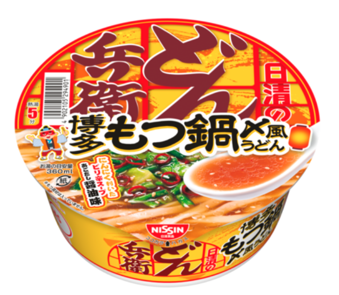 「日清のどん兵衛 博多もつ鍋〆風うどん」は、あごだしをブレンドした醤油をベースに、にんにくと牛の脂を加えた風味豊かなつゆを特長としています。もつ鍋の〆に楽しむうどんをイメージし、赤唐辛子から染み出すピリッとした辛みが広がる濃厚な一杯に仕上げたといいます。