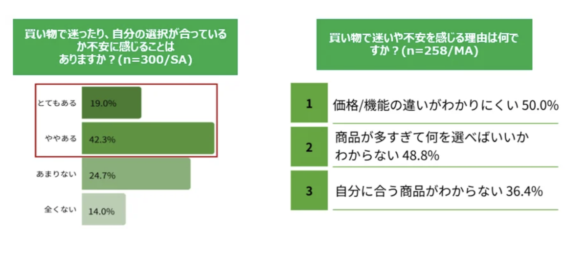 調査によると、買い物時に「どの商品を選べばいいか迷う」「自分の選択が正しいか不安に感じる」と回答した人は61.3%にのぼり、多くの人が選択に対して心理的負担を感じていることが明らかになりました。その理由としては、「価格や機能の違いがわかりにくい」(50.0%)、「商品が多すぎて何を選べばいいかわからない」(48.8%)が上位に挙げられています。