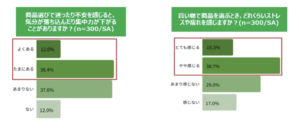 また、買い物時の迷いや不安がメンタル面に与える影響も確認されており、50.4%が「気分が落ち込む・集中力が低下する」と回答。さらに54.0%が「買い物時にストレスや疲れを感じる」と答えています。