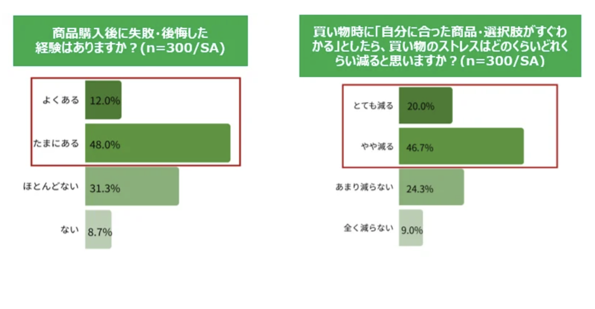 購入後の後悔についても、60.0%が「失敗や後悔を感じたことがある」と回答しており、選択に対する不安が購買体験全体に影響を与えていることがうかがえます。一方で66.7%が「自分に合った商品がすぐにわかればストレスは減る」と回答しており、適切な情報提供へのニーズも高いことが示されています。