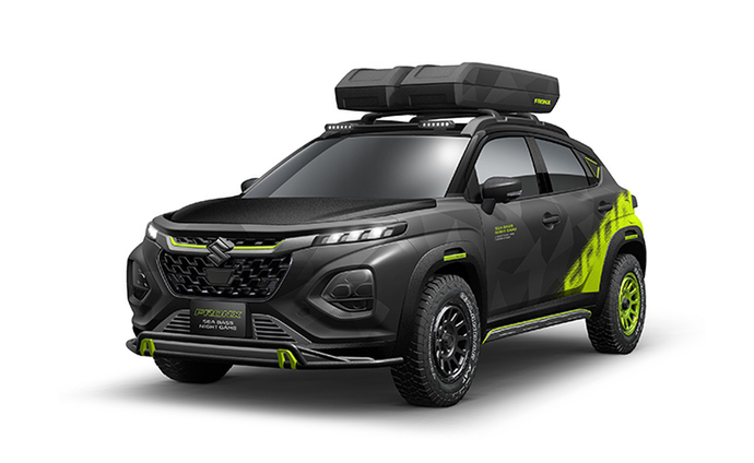 「ナイトメタル」は、フロントアンダーガーニッシュ、サイドアンダーガーニッシュ、リヤアンダーガーニッシュに加え、ブラック塗装のアルミホイールなどを組み合わせたスタイル提案。フロンクス本来のスポーティーで都会的な印象に重厚感を与え、新たな世界観を表現するとしている。