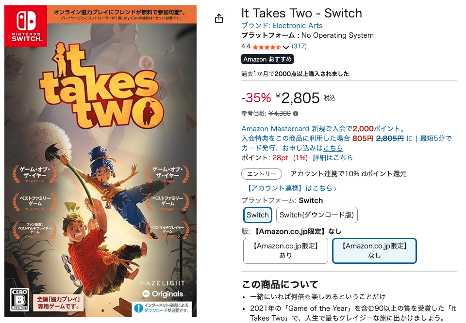 というわけで、今回取り上げるのは「It Takes Two」です。AmazonではSwitch版が参考価格4300円ですが、35%OFFの2,805円で購入できます(4月14日現在)。