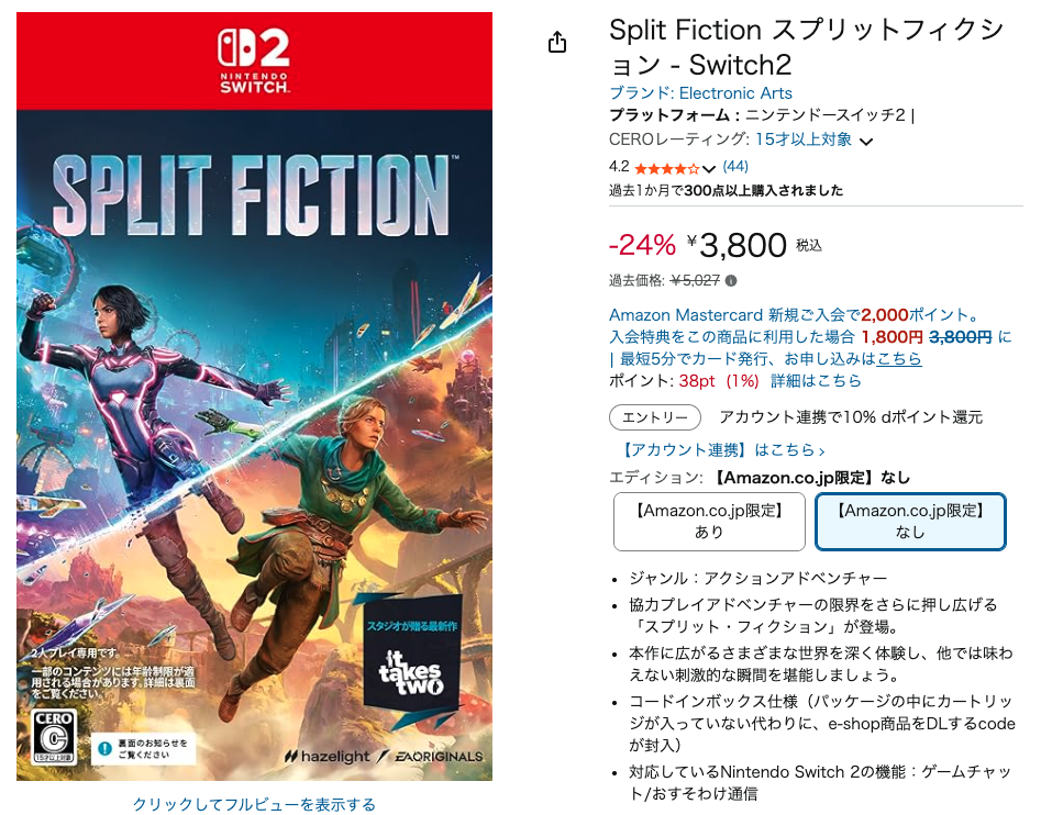 今回はもう一つ、ゲームをご紹介します。それが「Split Fiction スプリットフィクション」。AmazonではSwitch 2版が過去価格5,027円ですが、24%OFFの3,800円で購入できます(4月14日現在)。