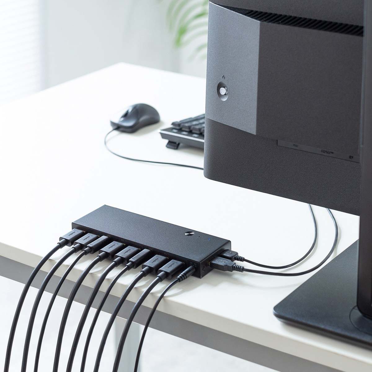 デスクの配線をスッキリ 2台PCを一瞬で切替できる4K対応KVMスイッチ