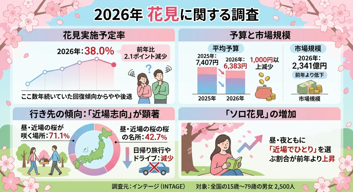 まず目立つのが、シンプルに「規模が縮んでいる」こと。ある調査では、2026年の花見市場は前年比で約2割減。予算も1人あたり1,000円以上減っており、かなりはっきりとした節約傾向が出ています。