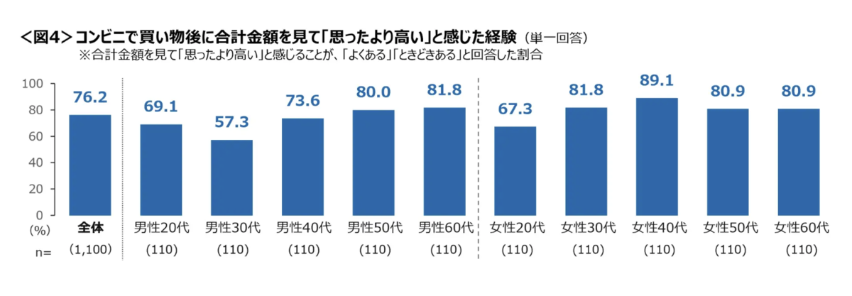 価格に対する認識では、コンビニでの買い物後に「思ったより高い」と感じたことがある人は76.2%にのぼりました。特に男性50〜60代、女性40〜60代では8割以上が割高と感じており、中高年層ほどその傾向が強い結果となっています。