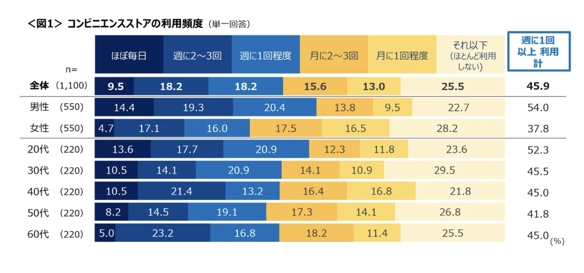 コンビニの利用頻度については、「週に1回以上利用する」と回答した人が45.9%となりました。特に男性や20代では5割を超え、「ほぼ毎日」利用する層も一定数存在しています。