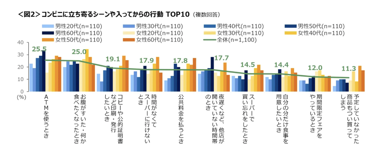 利用シーンとしては、「ATMの利用」「空腹時の軽食購入」「コピーや証明書発行」が上位に挙げられました。また、性年代別では、女性20〜30代は「期間限定フェア」、女性50〜60代は「公共料金の支払い」など、利用目的に違いが見られます。