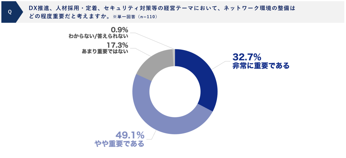 調査によると、88.2%が「現場からネットワーク環境に対する不満や改善要望を聞いたことがある」と回答しており、多くの経営層が現場の課題を認識しているという結果になりました。また、81.8%がネットワーク環境の整備を「経営上重要」と捉えていることも明らかになりました。