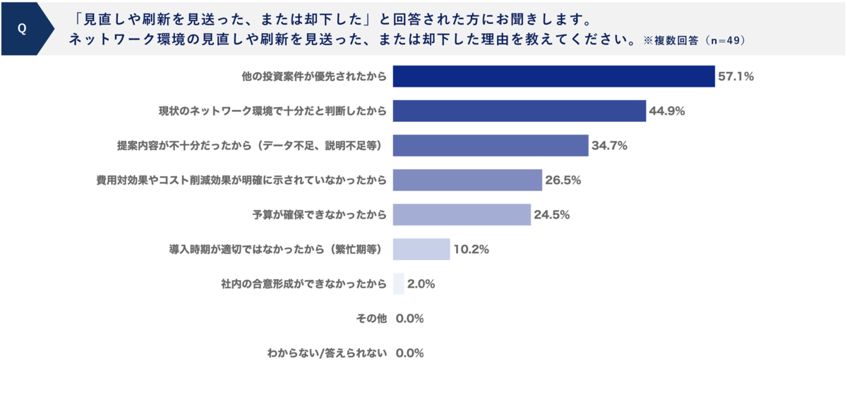 一方、却下理由としては「他の投資案件を優先」(57.1%)、「現状で十分と判断」(44.9%)、「提案内容が不十分」(34.7%)などが挙げられています。