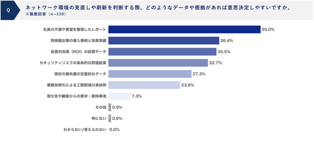 意思決定を後押しする要素としては、「社員の声を整理したレポート」(50.0%)が最も多く、「同規模企業の導入事例」(36.4%)、「投資対効果(ROI)の試算データ」(35.5%)が続きました。