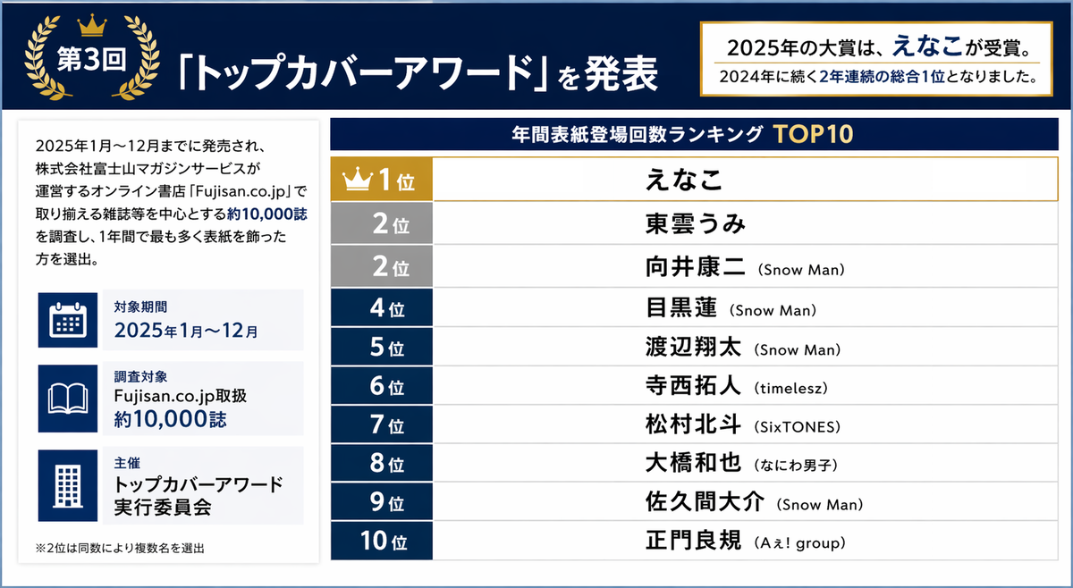 第3回「トップカバーアワード」で、2025年に最も多く雑誌の表紙を飾った人物として大賞に選ばれたのは、コスプレイヤーのえなこさんでした。しかもこれ、2年連続の1位。殿堂入り認定もされています。