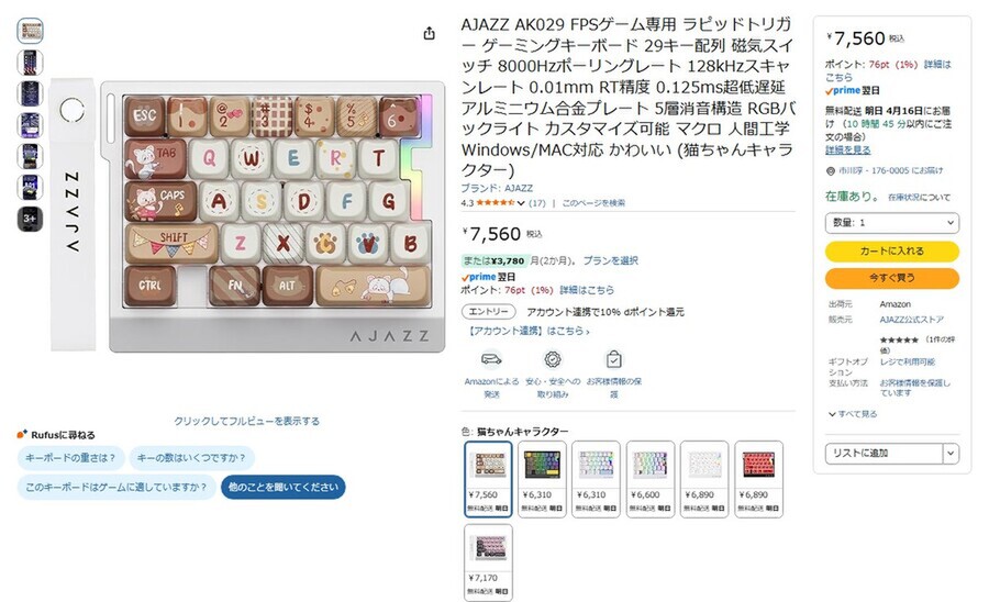 Amazon.co.jpにて、AJAZZの片手ゲーミングキーボード「AK029」が販売中だ。価格は7560円。