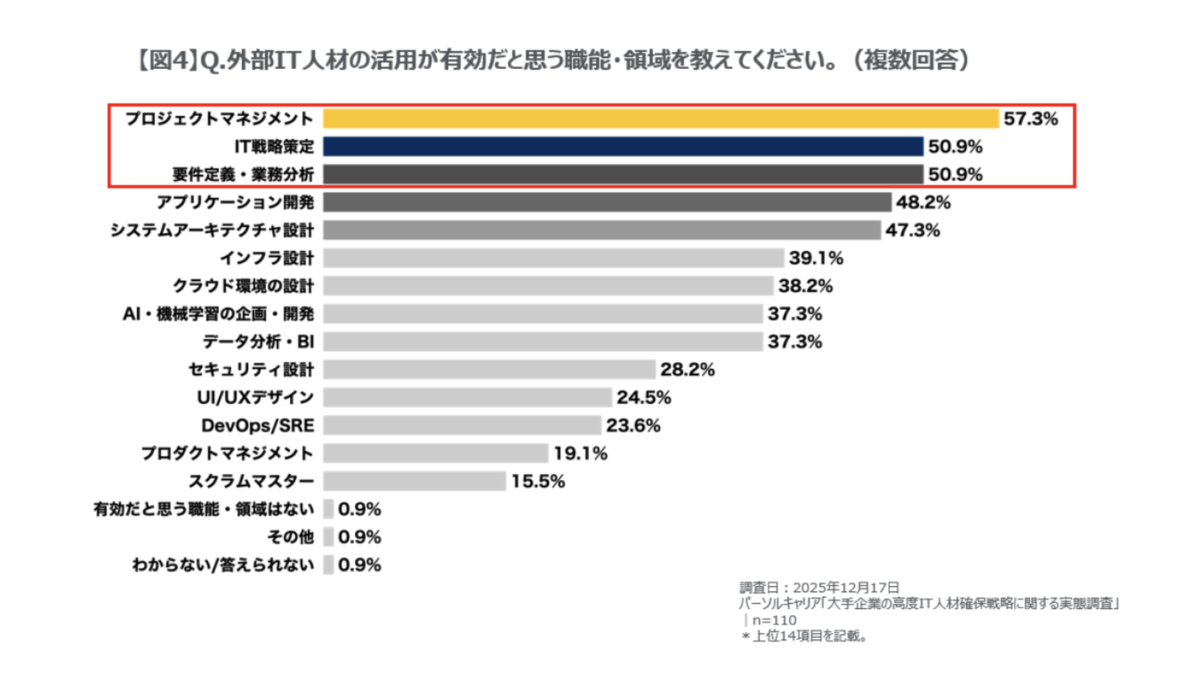 外部人材の活用については、「現在活用しており、今後も継続・拡大したい」が58.2%と最多となり、柔軟な人材活用へのシフトが進んでいることがうかがえます。特に有効とされる領域は、「プロジェクトマネジメント」(57.3%)、「IT戦略策定」(50.9%)などでした。