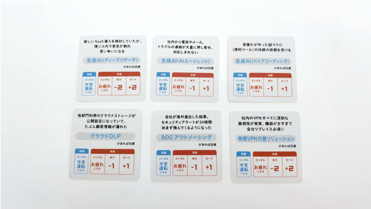 新版では、最新のサイバー脅威やITトレンドに対応したカードを追加。「VPNの脆弱性」「海外拠点によるセキュリティ負荷増大」など、現場で起こり得るリアルなシナリオが盛り込まれています。また、生成AIによる業務変化といった最新のテーマも取り入れられています。