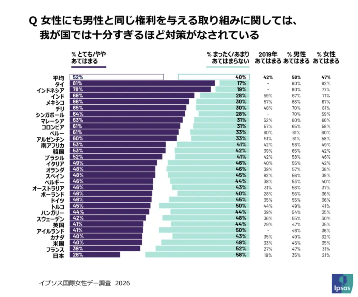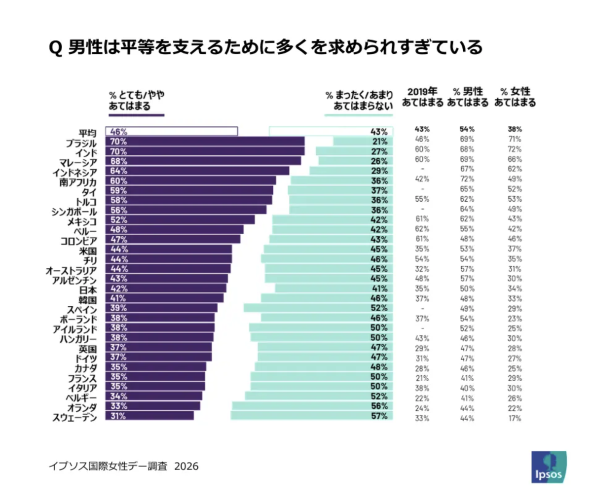 また、世界的には男性の間で「平等推進が行き過ぎている」「逆差別ではないか」という懸念も広がっており、男性の54%が「すでに十分な取り組みが行われている」と感じている一方、女性は38%にとどまりました。