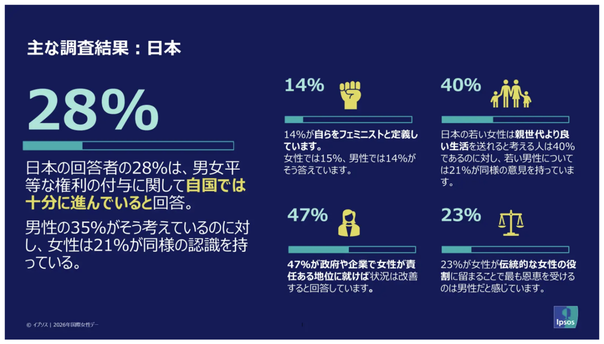 イプソスは、世界29カ国・約2万3,000人を対象に、男女平等に関する意識調査を実施しました。
