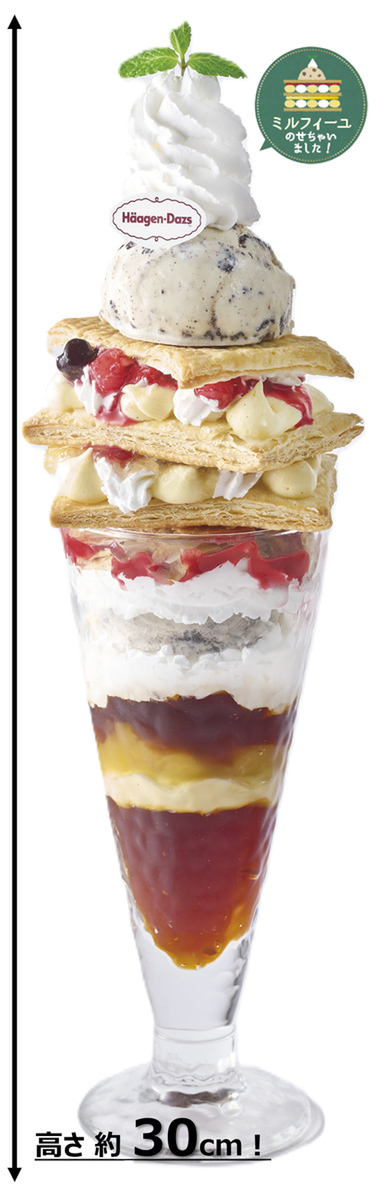 ハーゲンダッツのクッキー&クリームとアールグレイ紅茶のご褒美スイーツが登場します。特に高さ約30cmのパフェは見た目のインパクトもあり、写真映えも狙えそう!。