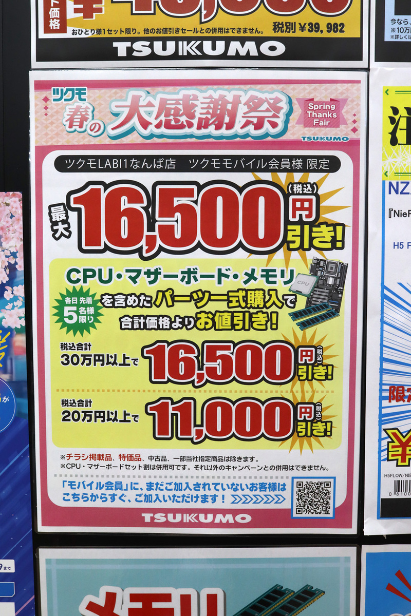 ひとつは「春の大感謝祭」。CPU、マザーボード、メモリーを含むパーツ一式購入で、合計30万円を超えると1万6500円引き、20万円超で1万1000円引きとなります。こちらは各日先着5名限定なので、お早めの来店がオススメです。
