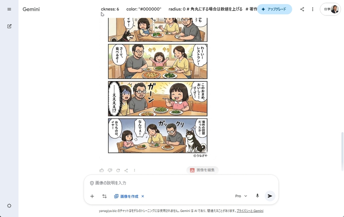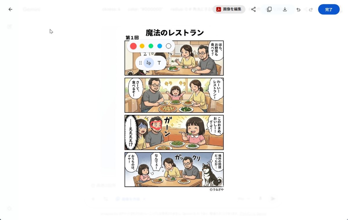 まずはGeminiでの操作方法から紹介する。筆者は趣味や仕事で、4コマ漫画を日々生成しているのだが、要素と文字が多い分、最新のNanoBanana 2や、高性能なNanoBanana Proでもミスをすることが多い。平均で6枚は生成するのだが、あとちょっと、というときは再生成するよりも修正することにしている。