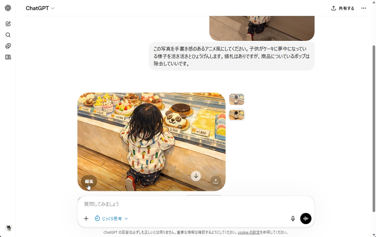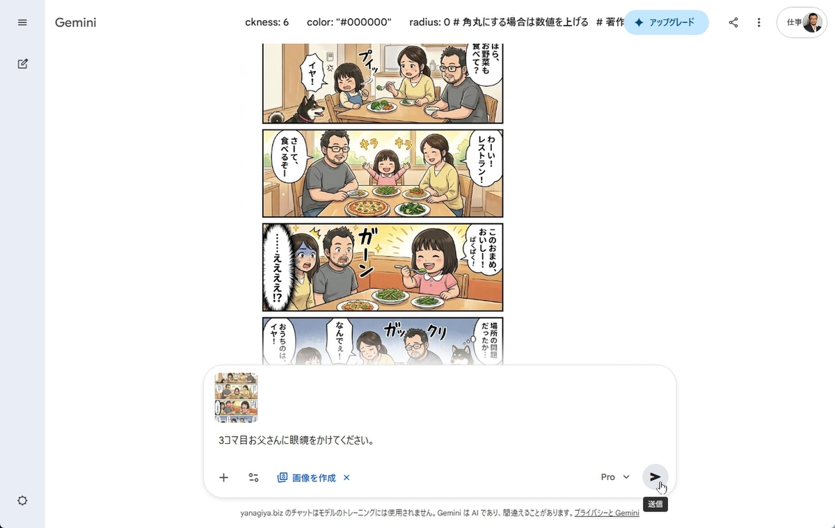 注意点が2つある。複数の修正をする場合は、あまり複雑だと対応しきれない。1コマ目のママの服、2コマ目のお皿の色、3コマ目のお父さんの眼鏡、など列挙すると挙動が不安定になるのだ。ステップバイステップで処理すれば対応できるが、そのたびに画質が劣化していくのもネックとなる。修正箇所が多いなら、部分修正を重ねるより、最初から全体を再生成する「ガチャ」に賭ける方がよいかもしれない。