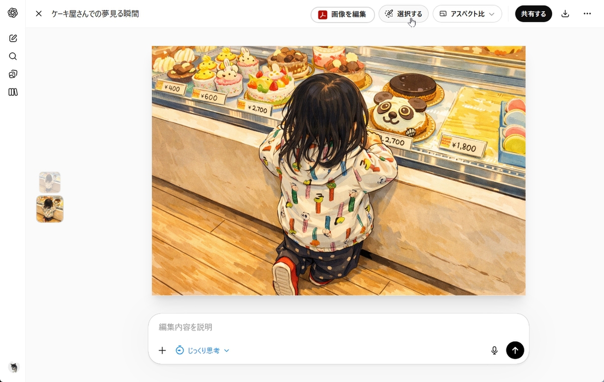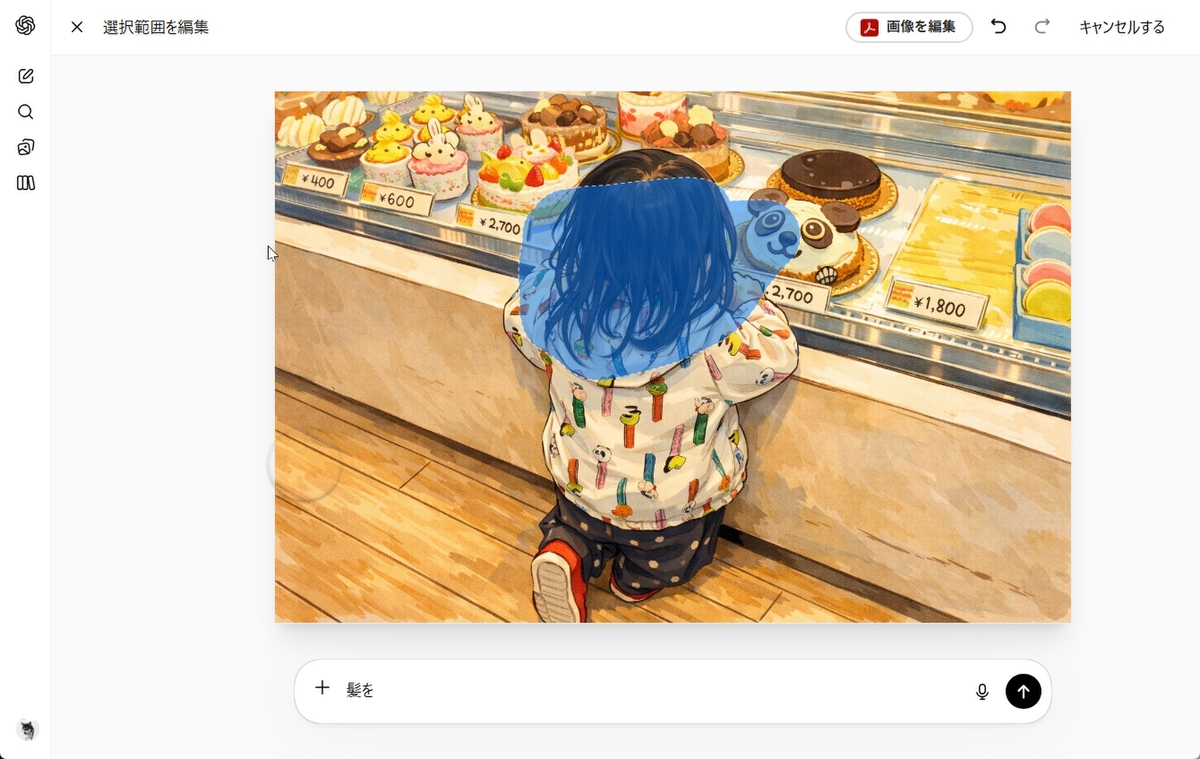 続いてChatGPTでの操作を解説する。ChatGPTの場合も、画像をクリックする。拡大画面になったら「選択する」をクリック。例えば、写真を元にイラスト化したら、リアルすぎて髪の毛がぼさぼさになってしまった画像を修正してみる。修正したい部分をドラッグすると、半透明のブルーで選択される。マウスを動かして、修正したい部分を網羅したら、画面下のフォームにプロンプトを入力すればいい。