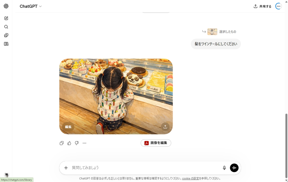 今回は髪の毛の部分を選択し、「ツインテールにしてください」と指示してみた。短時間で指示どおりに髪型が修正された。他の部分には影響がないので、存分に試せる。問題ないなら、「↑」ボタンからSNSにアップロードしたり、端末にダウンロードしたりできる。