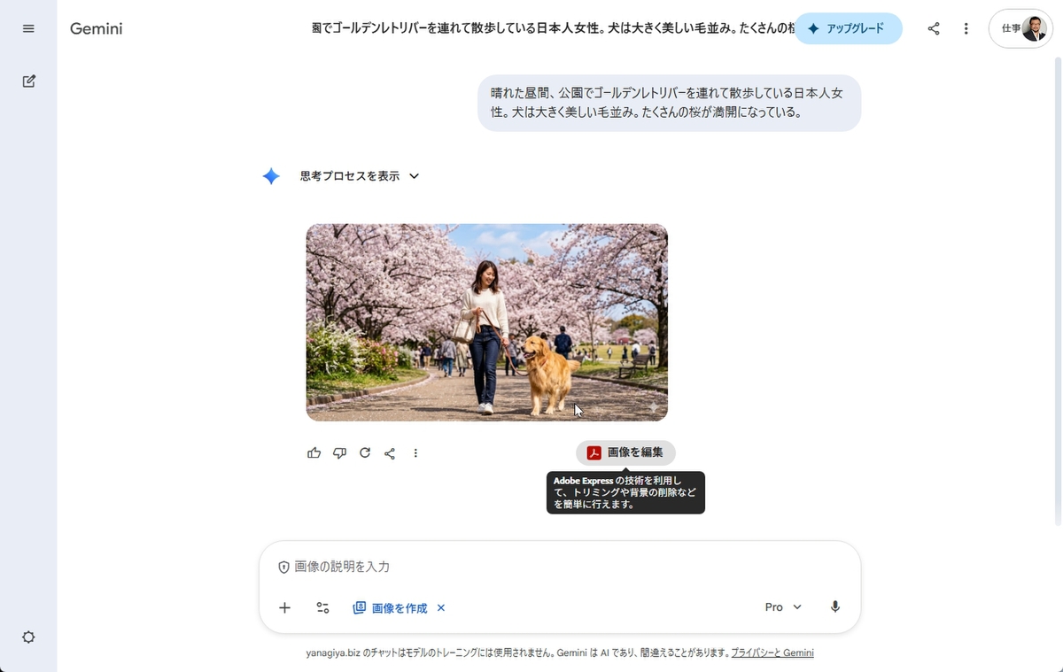ChatGPTもGeminiもAdobe Expressと連携しており、ウェブサイトを遷移せずにAdobe Expressの画像編集機能を利用できる。生成した画像の右下に、「画像を編集」ボタンがあるので、クリックするとAdobe ExpressのUIが開く。なぜか、アイコンがAdobe Expressではなく、Acrobatになっている理由は不明。