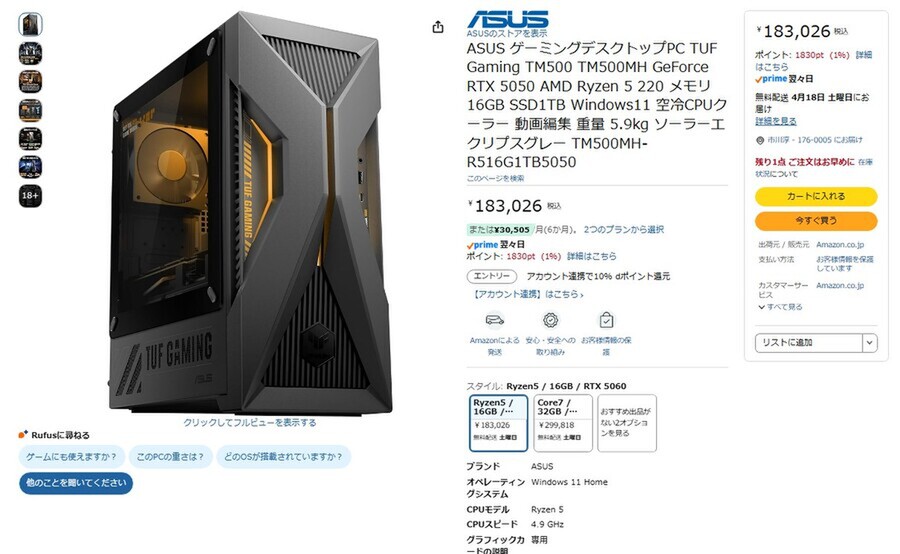 Amazon.co.jpにて、ASUSのゲーミングデスクトップPC「TUF Gaming TM500 TM500MH」が販売中だ。価格は18万3026円。