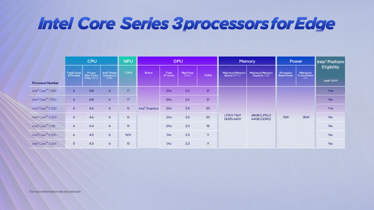 エッジ向けはCore 7 360、Core 7 350、Core 5 330、Core 5 320、Core 5 315、Core 5 305、Core 3 304の7モデルになります。