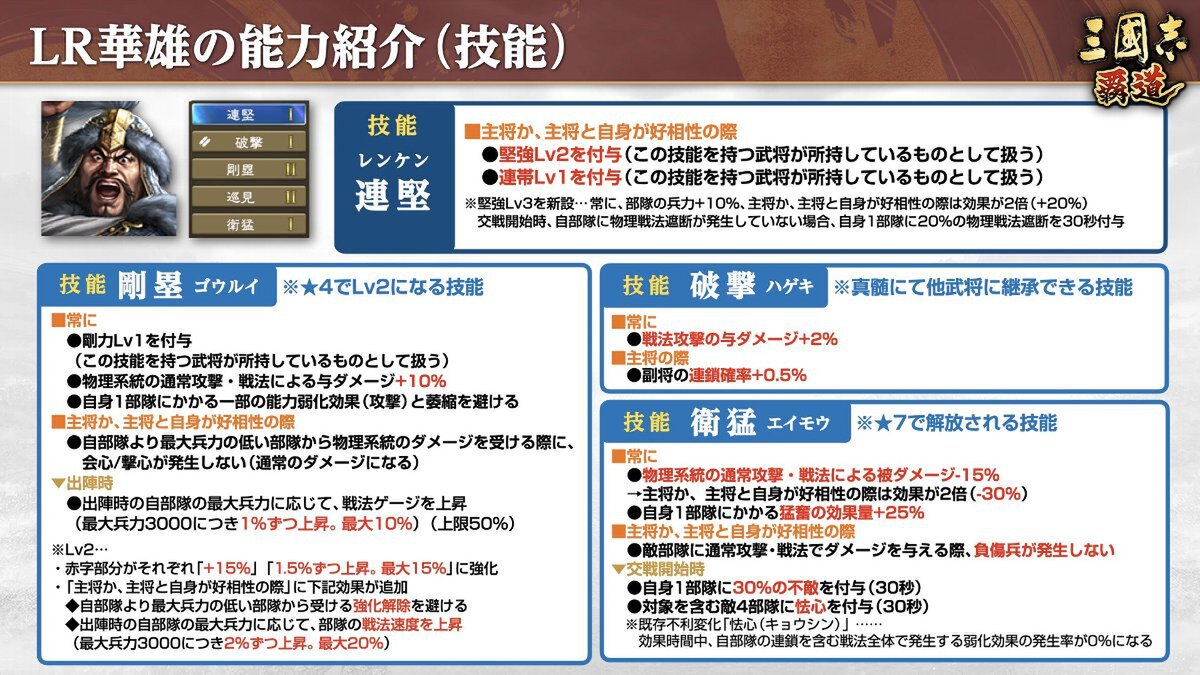 「LR華雄」は、高い物理耐久を持ち、戦法の回転も早められる騎兵武将。最大兵力を参照して条件を満たした際に、敵部隊から受ける物理ダメージで会心/撃心が発生しなくなり、戦法ゲージや戦法速度を上昇させることが可能だ。
