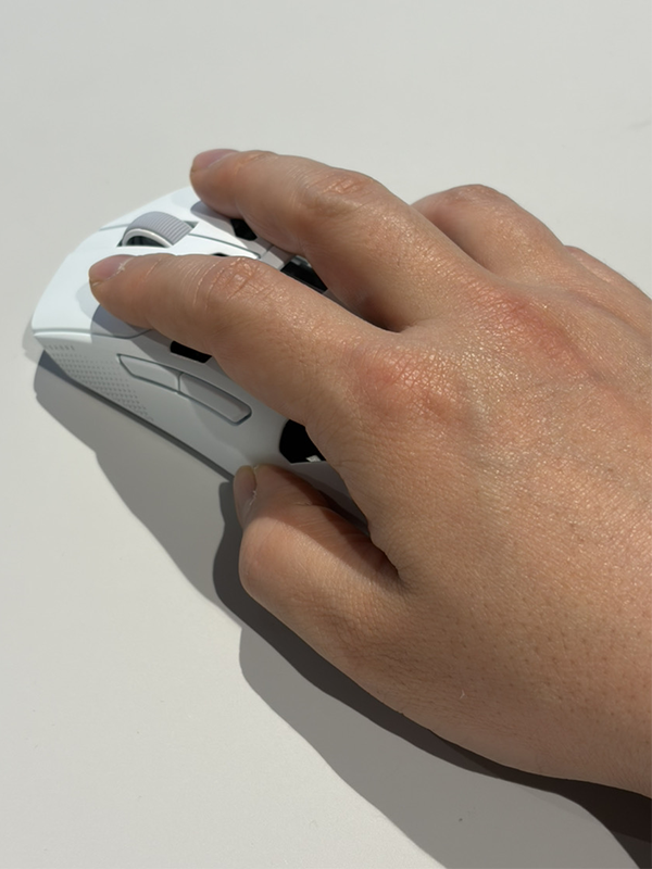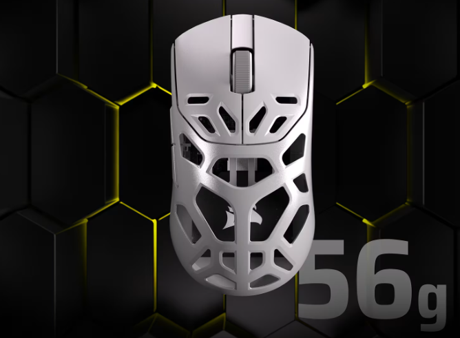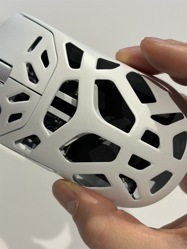 見た目からして“金属の重厚な質感”がビンビン伝わってきますし、手に取った時のほんのりとした冷たさは、安っぽいハニカムマウスでは絶対に味わえません。しかも、マグネシウム合金は「軽さ」と「強度」を両立する神素材。肉抜き構造で56gという超軽量を実現しつつ、握ってもビクともしない剛性を確保しています。