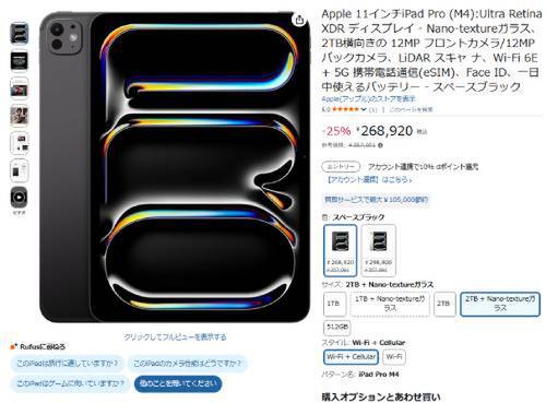 Apple 11インチiPad Pro (M4)がAmazonで割引対象。参考価格357,091円のところ、25%オフの268,920円で販売中。