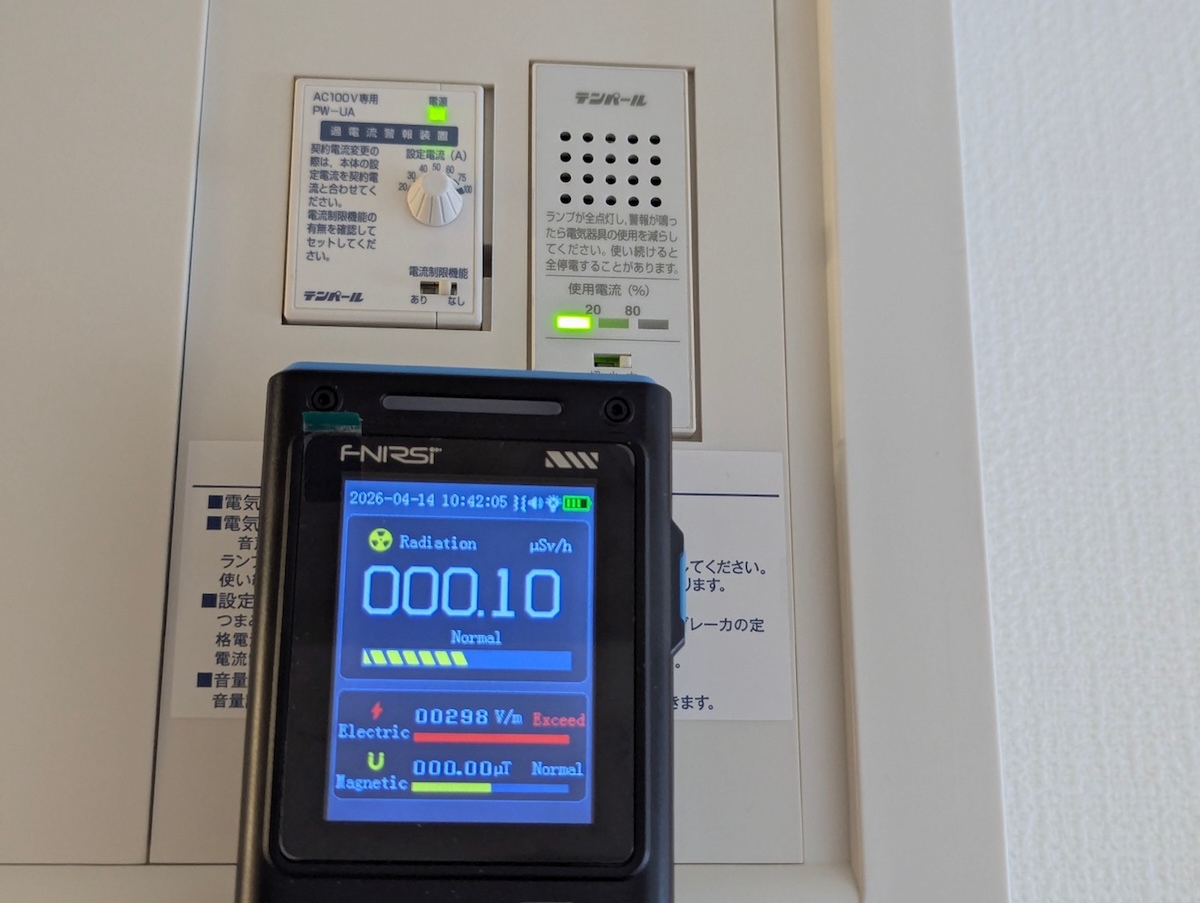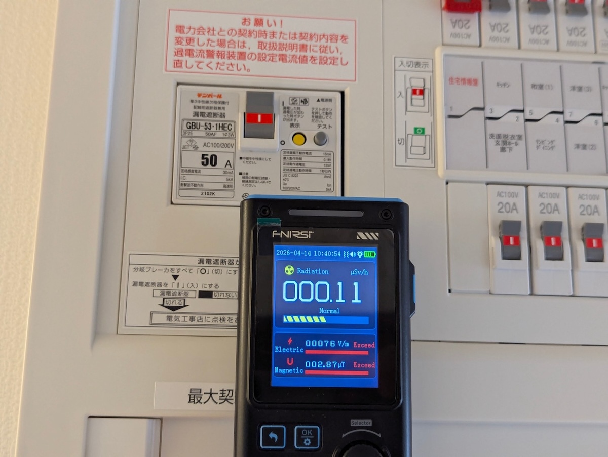 面白かったのは、分電盤の漏電遮断器付近と、過電流警報装置付近で挙動が大きく違ったこと。漏電遮断器付近は電界はそこまで強くないですが、磁界がかなり強く出ていました。これに対して過電流警報装置は、磁界がほぼゼロ。そのかわりなのか、電界がかなり強くなっていました。