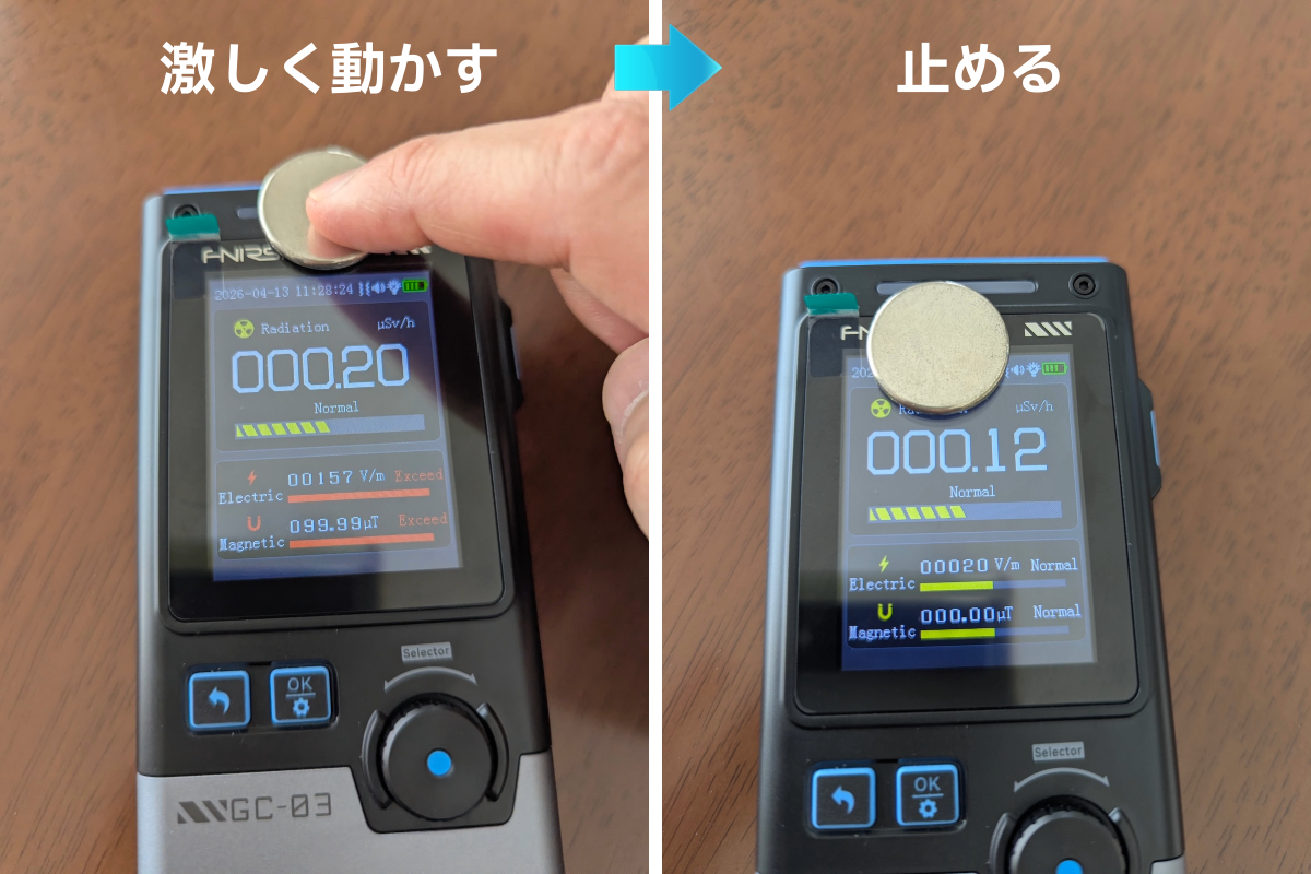 具体的には、磁石を本体上端近くで素早く動かすと、測定限界の99.99μTまで上がりますが、磁石を本体の上に置いて動かさないようにすると、0.00μTになりました。