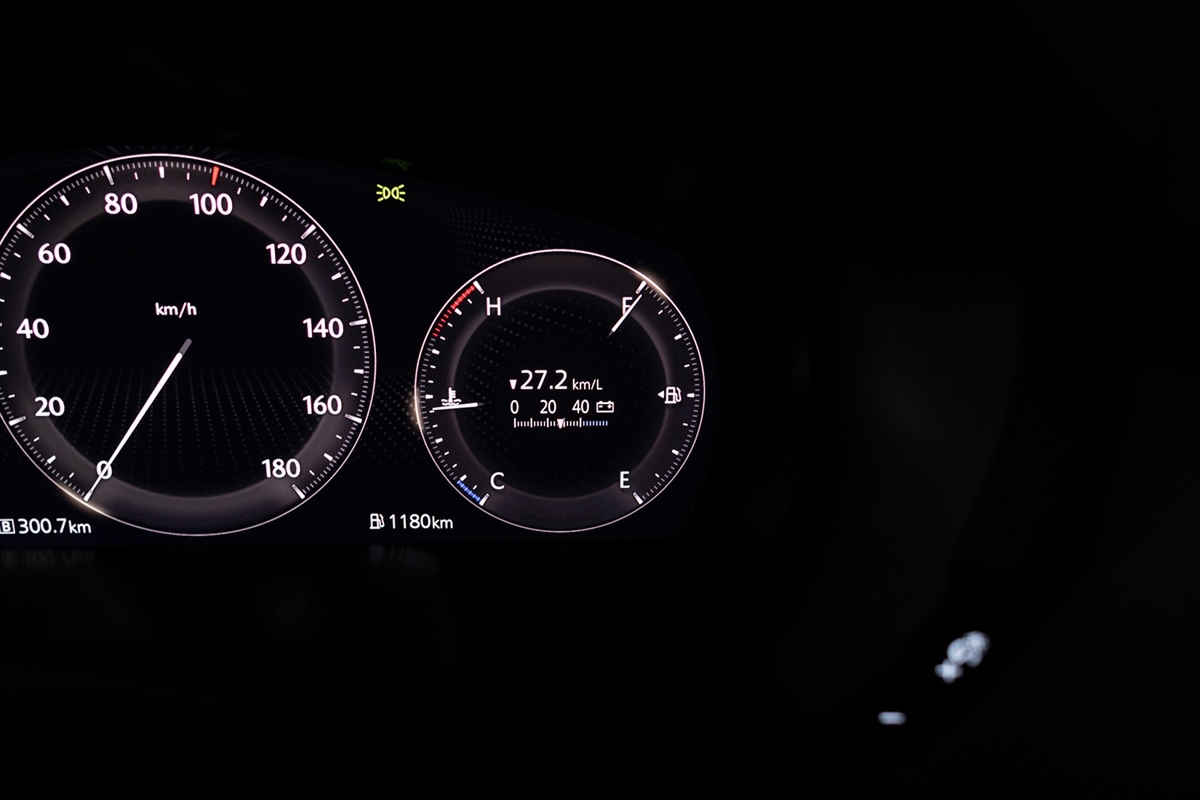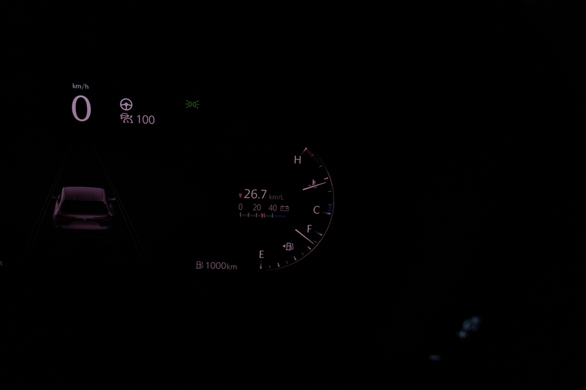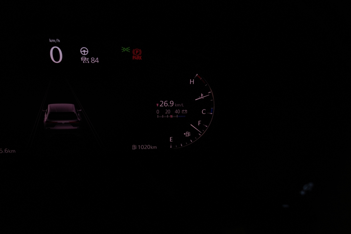 では燃費を見てみましょう。リッター26.9kmで、驚くべきことに給油ランプが点灯しないどころか、半分を少し下回った程度です。しかも「あと480km走行できる」というから驚き。そのままオートポリスを目指します。
