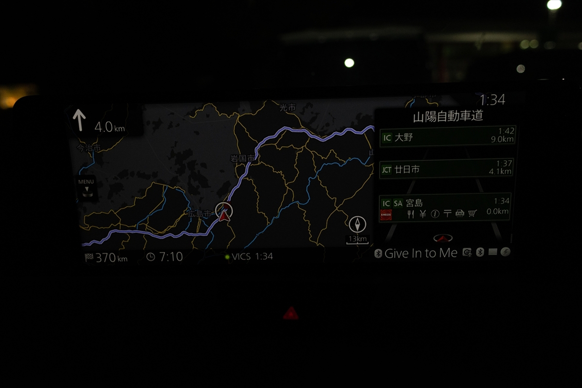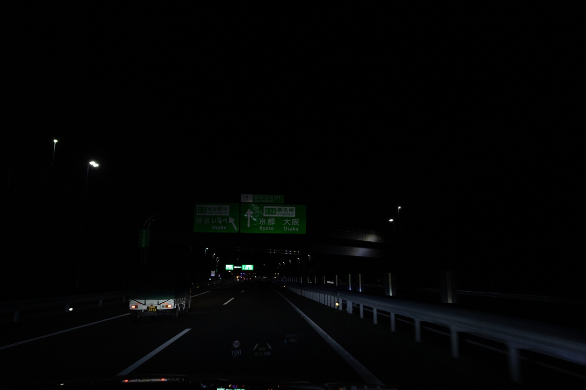 クルマは新名神→名神というルートの様子。というのも、土地勘がまったくなく完全にナビ頼りだから。陽は落ちて、標識を見ながら大阪や京都にいるんだな、ということしかわからず、黙々とクルマを走らせます。